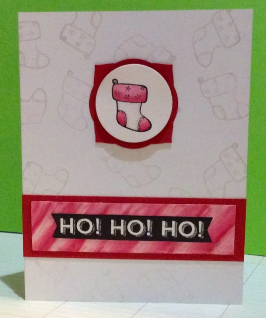 I also stamped the stocking (very old stamp) and colored it in with the same Prima crayons, but I just scribbled a tiny bit on my craft mat and used it like watercolor with a tiny brush. It is easy to work with and layer the colors (I used plain Neenah card.).
