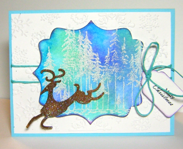 Here is one Christmas card I have made so far for July. The background was made by using Color Bursts. I stamped and embossed the trees using white sparkle ep. The deer is a die cut from cuttlebug. I added clear sparkle ep to it also.