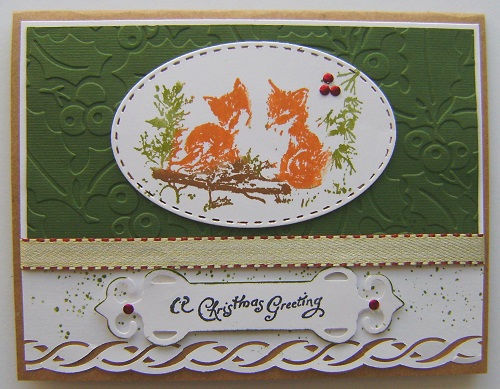This is another image from Heidi. These foxes are so sweet! I colored them by using my small cube Distress inks and tapping colors on the image with one corner of the ink pad. The image was cut out using a stitch oval die. I used a marker to fill in the "stitches." This was pop dotted to a holly embossed background. The green splatters at the bottom were made by using a splatter dot stamp.