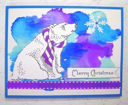 For the A prompt I used an alcohol ink background. I fussy cut the bear by Stampendous and adhered him to the background. I punched a snowflake and added glitter and an enamel dot. The saying is from Sparkle N Sprinkle. Ribbon was added at the bottom.