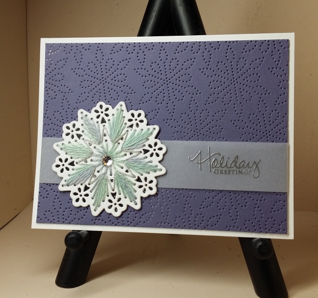 I made fifteen snowflake cards. Although it doesn’t show up in the photographs, when the light hits the card, the silver mirror cardstock shines through the perforations in the Memory Box Pinpoint Snowflake background. It’s quite beautiful. (Card #4 shows a little bit of that.) Warning: Be prepared to run that MB die back and forth several times if you want it to pierce the entire design. Most of the chads came out, but even after using a brush on them, I still needed to use a piercing tool to remove many chads. It was worth the effort.
