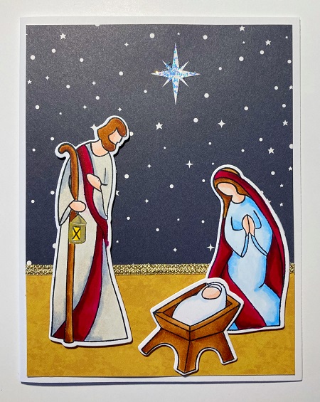 I used a new stamp and die set I bought at a recent stamp show, by Colorplay. I colored the images with Spectrum Noir alcohol markers and pop dotted them to the card. I used Stickles Icicle glitter glue on the large star.