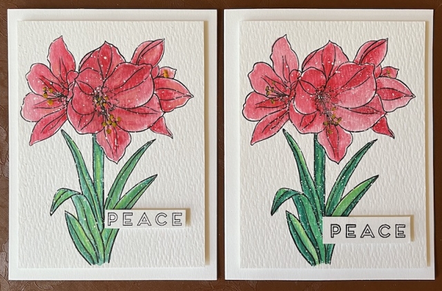 I stamped on the textured side of Distress Watercolor Cardstock using Gina K amalgam ink. I bought a small cube of the ink at Stampfest and I'm happy with it. I colored Neocolor II watersoluble crayons direct to the paper and spread with a wet brush. I used a little bit pinker red on the right one and tried to leave a bit more white space (hard for me!).