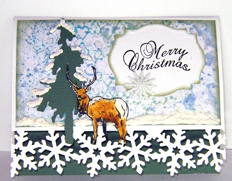 I love how I can see a little bit of harlequin design in the background. Your gelli print turned out wonderfully! I really like the way you placed the tree and that awesome deer down in the snowflake border.
