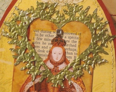 For the metal embellie, I cut a beverage can into a sheet. Used a large heart punch first. Then used an oakleaf punch to make the nibbled outer edge.
