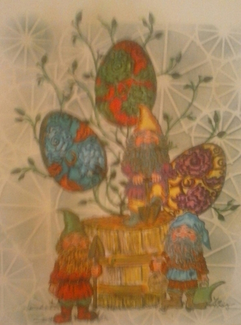 I had fun with this. I did lots of masking & used markers to make my eggs from complimentary colors--red/green, blue/orange & yellow/purple. I also colored the dwarf clothes in similar fashion. Fun fact... When u combine complimentary colors they make wonderful new ones!