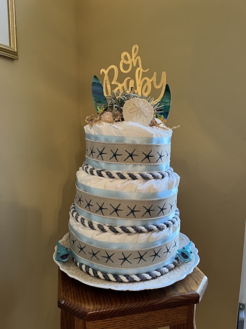 My DD and I volunteered to make the diaper cake for her friend's shower. My DD had a whole box of newborn diapers that my grandson was born too big to wear! If the diapers don't fit, make a cake, ha!