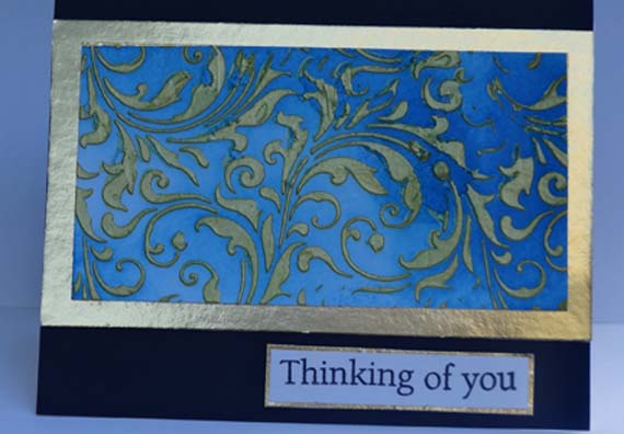 It's been so windy here that I had to tack down the top corner to get a photo. I swiped gold liquid pearls through a Tim Holtz flourish stencil and used 3 shades of distress ink for a the background resist technique.