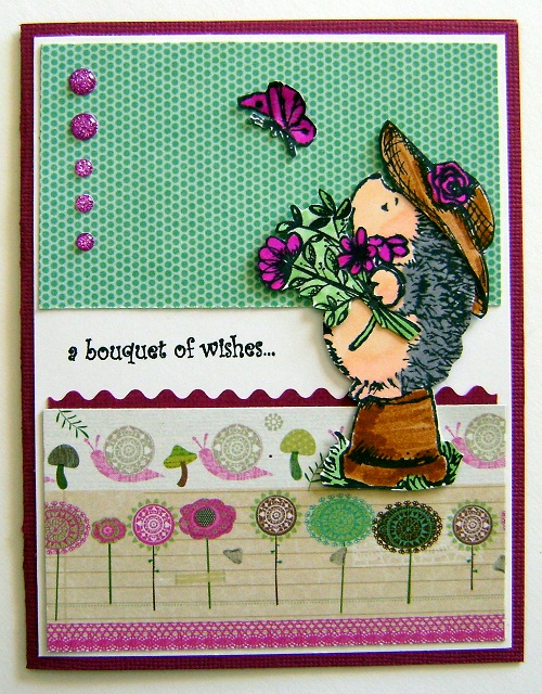 I used a hedgehog stamp from Penny Black. I added the hat from Tim Holtz's accessories stamp set. The hedgehog was already holding one flower, but I added a bouquet of flowers to it from the same stamp set. The saying is from Just For Fun. I colored with dye markers and alcohol ink markers.