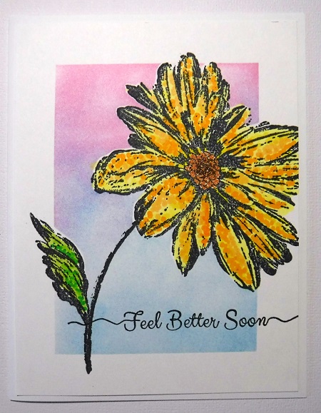 I am glad you had us do some masking. I don't do it often but I like how it turns out. The background was colored with pink and blue Distress inks. The flower is from Penny Black. I colored the flower using alcohol markers. The center of the flower was colored with glitter gel pens. The saying is no brand.