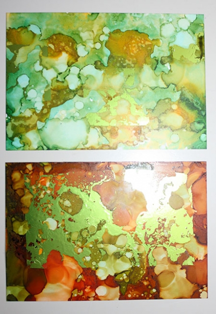 I followed April's challenge by adding drops of alcohol ink onto Yupo paper and then using a paint brush to add drips of alcohol onto the finished card front. I have lots of Foiling paper so I chose lime green. Went a little heavy on the brown and was disappointed when I went to cut out portions of the background to create for my Tim Holtz Harrison and Tim Holtz Funky Trees. Thanks April for making me push the envelope.