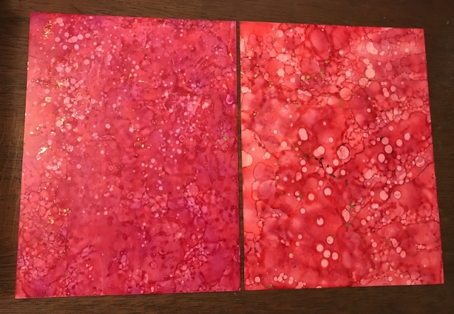 I used Ranger alcohol inks on yupo paper and gold Deco foil. I couldn't for the life of me get the 91% alcohol drips to fall in a straight line!