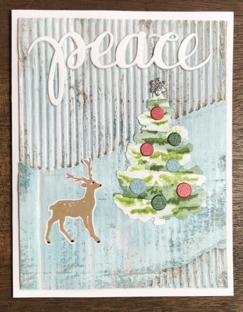 I used one of my glue and ink backgrounds from Connie's challenge to die cut a Christmas tree. I came across the cardboard background in my stash from one of April's previous challenges. The backgrounds we make come in handy!