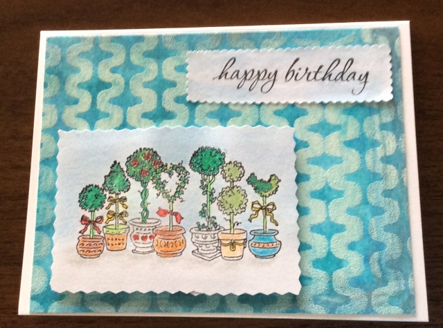 Used background I made, added a watercolor pots scene. Cut edges of words and watercolor to match design in background