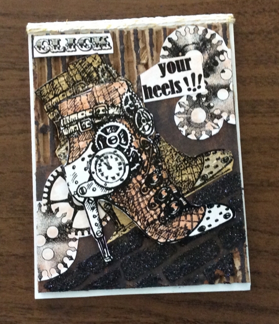 Stamped images, embossed, colored with pearl watercolors, cut out Bottom shoe was stamped on gold crinkle paper,( didn’t show up good, why it’s on the bottom)