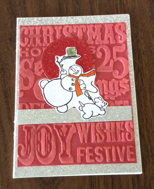 Stamped, embossed, colored, cut out snowman. Added strip for him to walk on and a red circle to make image larger. Image is a Michael Strong stamp.