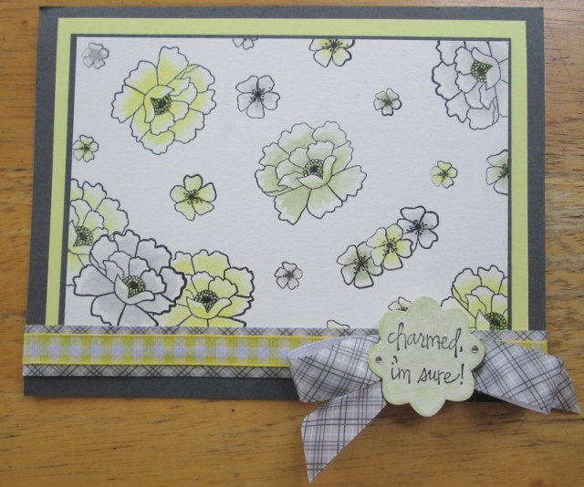 The background was created using a Fiskar stamp that I preformed surgery on so that I could use the individual flowers separately. I also did some masking to create the clusters of three. I colored it with watercolor pencils. It was actually inspired by some cushions I saw at Bed, Bath and Beyond.