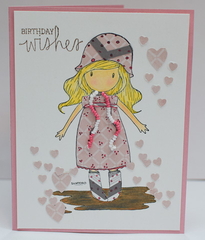 This is a Santoro stamp. It stamps the girl, the bottom hearts, and the puddle all in one. I stamped onto a white piece of card stock, then on a piece of pink with white squares, and then a piece of zigzag paper. I cut out the hat and dress from the pink paper. I cut out the boots, the belt on the dress, and the zig on the hat out of the other paper. I then colored the girl's skin and hair with Derwent Colorsoft pencils. I used a wink of stella glitter marker on the hem of the dress, the dots on everything and across the belt of the dress. I then glued the dress, the hat, and the boots on the little girl. I then punched out a bunch of hearts to glue on over the stamped hearts. The little girl had a necklace/scarf type of thing around her neck so I strung together some seed beeds and made her a necklace. The puddle is also colored with Derwent Colorsoft pencils.