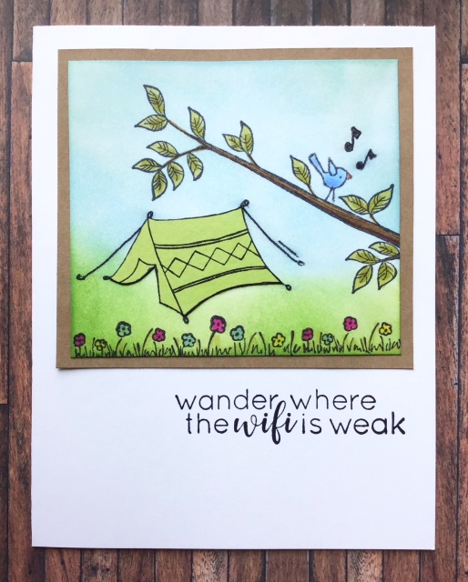 This card uses 3 sets from Elizabeth crafts and one from Purple Onion. I stamped the scene, colored it, added distress ink to the background and then paper pieced the tent. I should have added the color to the background first.