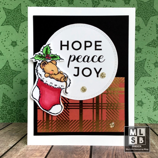 Supplies: Penny Black Jolly Friends, Simon Says Stamps Peaceful Christmas stamp set, Elizabeth Crafts Holiday Cheer stamp set, Memento and Versafine black inks, Recollections Christmas Plaid paper pack, Gina Marie Wonky Stitched Ovals dies, Avery Elle Wonky Stitched Rectangle dies.