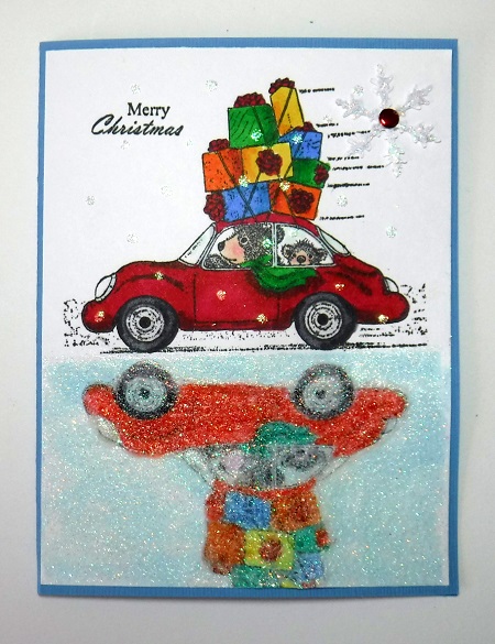 I made the car look like a reflection in a body of water. I used acetate to stamp the reflection and glued it on upside down. I then covered it several times with sparkle embossing powder. I added stickles glitter dots for snow and added a punched glittered snowflake. The image is a House mouse image and the saying is from Sparkle N Sprinkle.