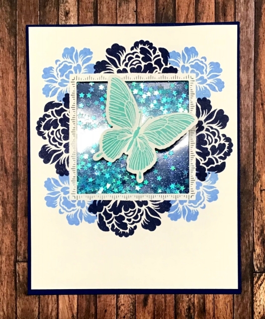 I used some Gina K Stamps for this. First I did the masking with a 2.5 inch square mask. Then I had a Gina Marie in and out die that fit perfectly inside that to do the stitched lines.