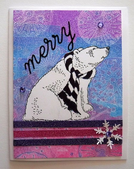 My favorite. You know how much I love this polar bear. The background is beautiful, and I like the three glittered stripes you added. TFS. Daria