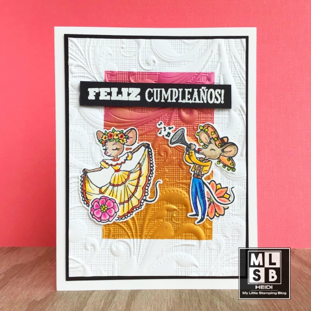 I used Picked Raspberry and Wild Honey distress inks, and then gold PP. The embossing folder is the one that came with my Gemini Jr. I have been looking forward to using it and this was the first time! The stamps are from Hero Arts.