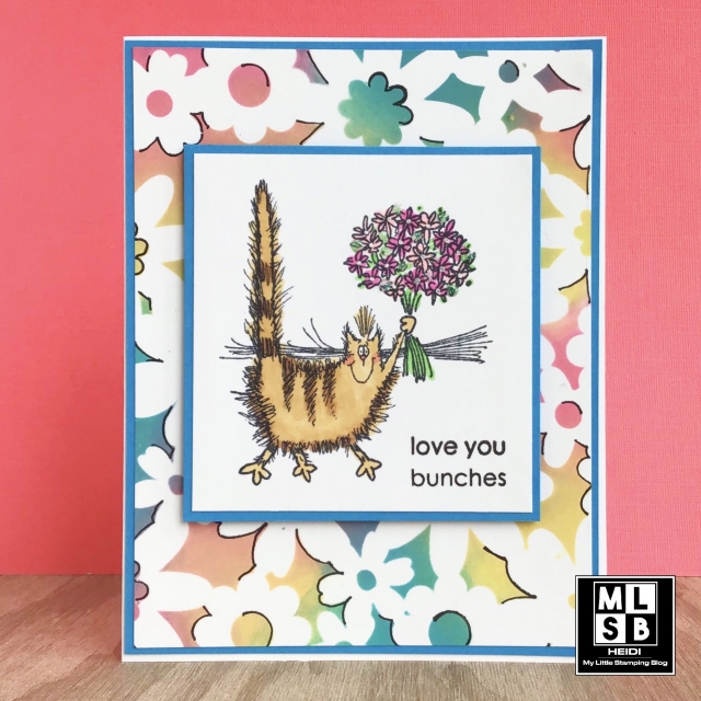I finished this card by stamping my Penny Black cat and coloring it. I did add a little stickles to the bouquet. I didn’t add any embellishments or anything because I think the colorful background was enough.