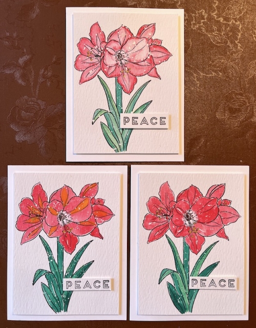 I played around with different ways to color the Amaryllis. The one on top I colored from the outside of the petals getting lighter toward the inside. I used the Neocolor direct to paper and blended out with a wet brush. I scraped neocolor ruby red and orange in to a palette dish using a craft knife, mixed with water and painted the bottom left flower. The bottom right is ruby red from the palette. I tried to paint with more dabs and leaving more white space rather than painting with brush strokes. All are spattered with watered down white gouache. (and boy did I spatter everywhere! even though I used a splat box). Since I didn't think my enamel accents worked very well on the first cards, I used a ball stylus and Wild Honey Distress paint on the pistils. Then I went over them with a Clear Star gelly roll pen. I used a ball stylus and just a bit of Stickles on the very centers of the flowers.