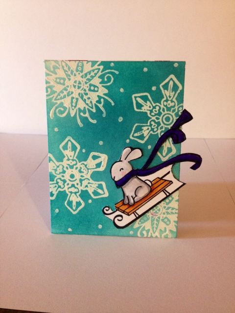 Using some mixed media paper, I stamped my snowflakes with gesso on to it. Let dry, then blended distress inks in salty ocean, peacock feathers and broken china on to it. Colored the bunny image with markers & colored pencil. fussy cut, adhered to the tag. I added a Sakura glaze pen to his scarf to add some texture. Added some snow dots to the piece with a white gel pen. TFL :)