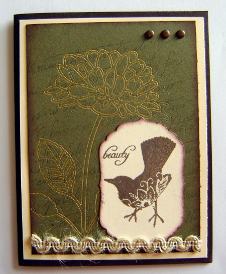 So neat. I really like that bird too. I like the brown gem/brads? and the ribbon at the bottom.