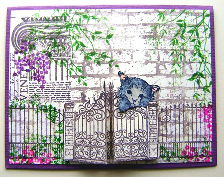 This was really out of the box for me. I used a column stamp, brick stamp and gate stamp for this -- to make a garden scene. Thanks for the fun challenge!