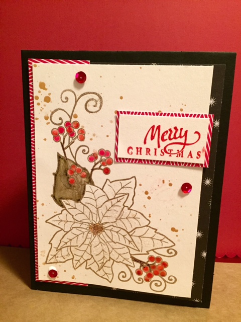 I watercolored the berries and leaves with distress and to bow markers. Added the gold droplets using perfect pearls.