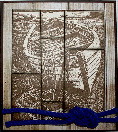 I stamped out my image using Walnut Stain Distress ink onto Very Vanilla card stock. Next, I cut my image in vertical strips then horizontal strips. All the edges were distressed with Early Espresso (SU) and put back together and mounted on wood grain designer paper.