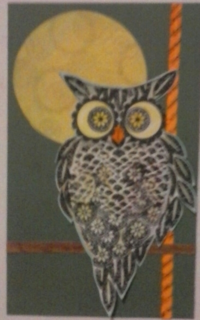 Created the owl using several stamps--pineccone, medallions, leaf. Moon is watermark ink, medallion stamps & crayons.