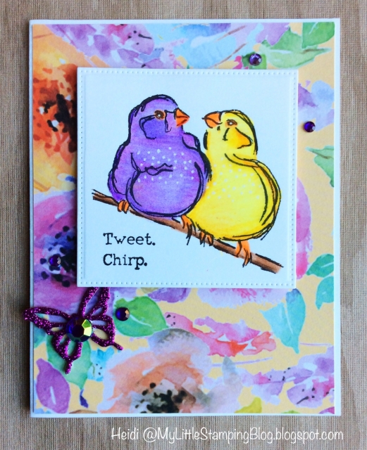 Supplies: Ranger Little Birdies stamp set, Versafine Onyx Black ink, Prismacolor pencils, MFT Die Namics Pierced Squares die, Love Nicole Aquarelle 6x6 Paper pad, embellishments from my stash.