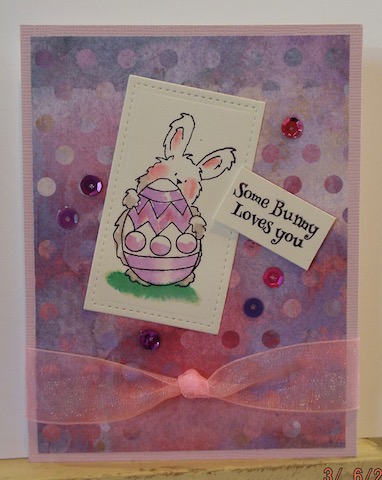 Stamped image on die cut, and watercolored with markers. Adhered to patterned paper, and embellished with ribbon and sequins. Stamps: Art Impressions. Die cut: Spellbinders. TFL