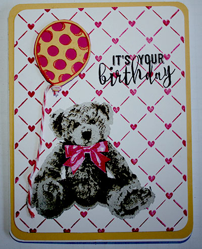 I stamped out my bear. Next I created a mask and placed it over the bear, then stamped Love Harlequin over the entire surface. Next I die cut the balloon and pop dotted it to sit up from the card front. I tied Baker's Twine around the balloon and glued it to the bear's hand.