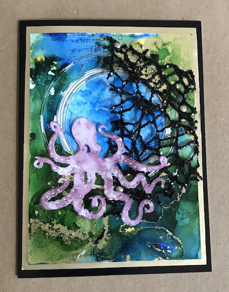 We pounced blue alcohol inks on the die cut circle (inside of the porthole) and adhered it behind the opening. The port hole layer was made with blue, greens and Pinata gold inks, and maybe a little black? or is that a dark blue? I can't remember. I think the octopus was pounced with raisin ink. The card bases we were given in class were folded unevenly and the fold was cracking. Ugh! So today I finally finished this card with the help of Undu. I made a card base from 12x12 black glossy cardstock as these cards are A6. The sparkly mesh ribbon is attached with brads and dots of glue.