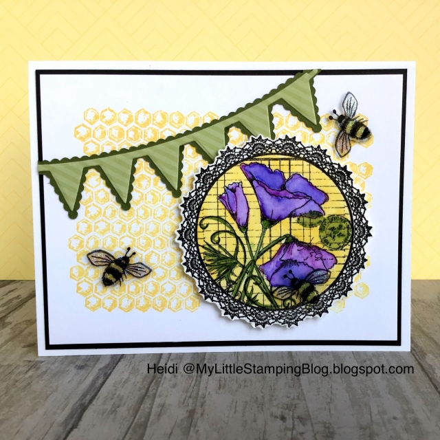 My bees were colored with both stickles and alcohol markers. I applied them with a new clear dimensional tape I saw at CVS, from Gorilla glue! I was concerned that it would bond to the stickles and then the bee would detach, but April said that it came through the mail fine, so maybe this will be a good new adhesive to have around! At the stamp show, I know they were selling a different clear dimensional tape, too.