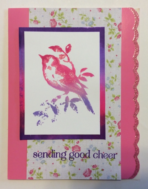 I inked up the bird with the multi color ink pad and then spritzed it with water mixed with perfect pearls. You might be able to see the interesting way the perfect pearl settled into a highlight on the image. I don't know why it worked that way!