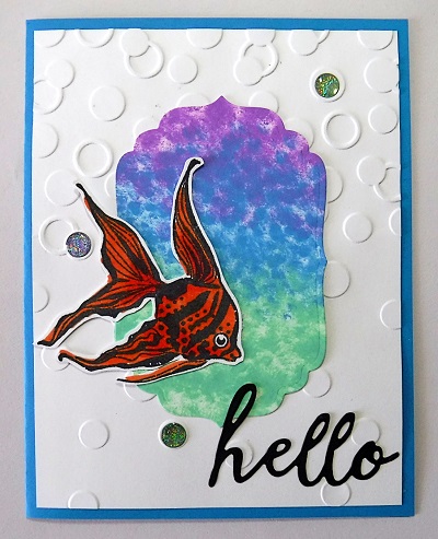 Here is my card for my challenge. I ended up using a die to cut a shape from the background. The fish is from Inkadinkado and the die is no brand. I also used a bubble embossing folder from Darice.