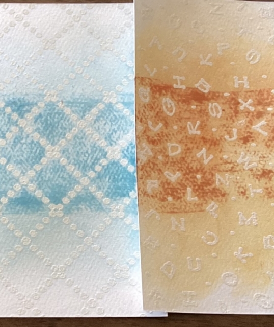 Two backgrounds made on watercolor paper and Versamark ink and distress ink and baby wipe.