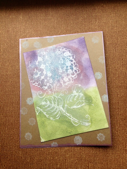 Here's another card I made by stamping my image in gesso. This time I blended some HA shadow inks and versamagic chalk inks over the flower image.