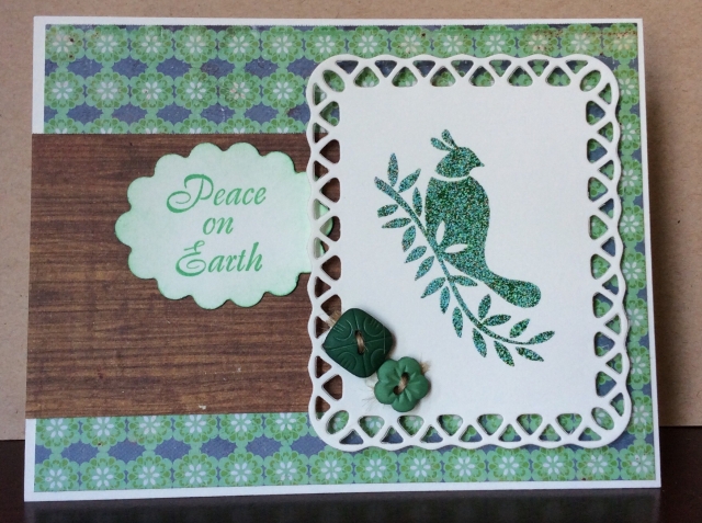 I heat embossed the Partridge image (Gina K) with Ranger Verdigris embossing powder. Such a nice look for chunky stamps! Paper is Crate Paper Peppermint. Sentiment is an old wooden stamp from one of those packs of 50 small Christmas stamps.