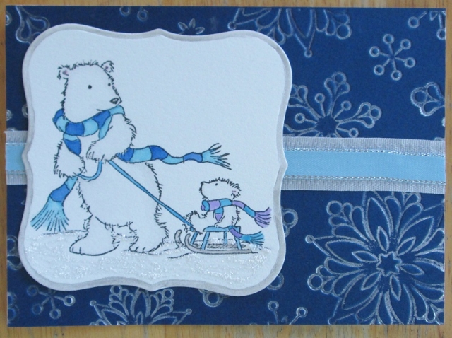 I used a brayer to add silver colorbox pigment ink on a Darice embossing folder. The image is by Lily of the Valley and colored with Twinkle H2Os. I added stickles for the snow. The ribbon is actually two ribbons layered together.
