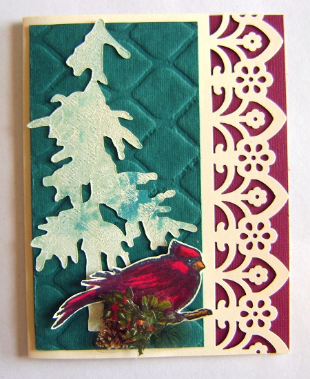 That cardinal is gorgeous! I love the tree cut from your background and the embossed piece behind it.