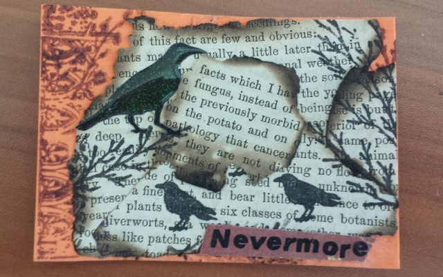 For my ATC I used orange craft foam as the base. I stamped a border on the left side of the craft foam in Stazon Ganache. I found a piece of paper from an old book and burned the edges. I blued down 3 different pieces of book paper. Stamped the ravens in black, then the tree branches. The larger raven is a puffy sticker. Nevermore is rub on letters on a piece of pattern paper.