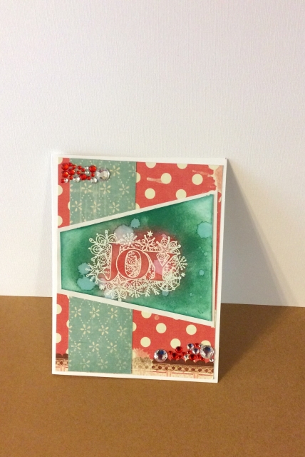 This card was supposed to be a full panel with the joy embossed on it but I dropped my blending tool on a part of it. I didn't want to trash it so I cut the mistake off of it. Card size is 5x7